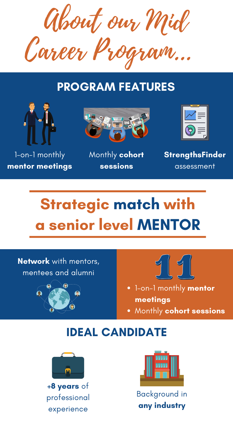 The Mid-Career program is aimed at professionals with a demonstrated track record seeking to elevate their impact. Through a curated curriculum including a peer-to-peer cohort experience and dedicated 1:1 mentorship, the program prepares participants for senior leadership roles. Areas of development include, strategic thinking, executive presence, and peer collaboration.